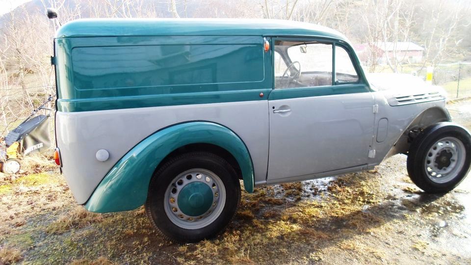 Schon seit 1937 wurde der von Louis Renault selbst gezeichnete Juvaquatre produziert während das Unternehmen erst 1946 auch eine Kastenversion fertigte. Diese als „Break“ bezeichnete  Karosserieversion bot auf seinen 3,75 Metern Länge reichlich Stauraum und fand nach dem Krieg großen Anklang. Das ca. 760 Kilo leichte Fahrzeug war mit einem kleinen Vierzylindermotor denn auch ausreichend motorisiert. Heute sind diese „fourgonettes“ kaum mal im Straßenbild zu sehen – zu oft wurden sie im harten Einsatz verschlissen. An eine aufwändige Restaurierung machen sich – mit Hinblick auf den Marktwert – nur wenige Idealisten. Und so sind die eigentlich idealen Werbeträger nur selten im wirklich überzeugenden Gesamtzustand zu finden. Der hier gezeigte Juvaquatre wird vom aktuellen Eigentümer als nicht vollendetes Projekt angeboten, wobei schon viele kostspielige Arbeiten (wie die Aufarbeitung des Chassis und Aufbau samt neuer Lackierung) erledigt wurden. Auch der Motor wurde von einer Werkstatt (in Schweden) bereits überholt, wie auch die Sitze und weitere Teile. Komplett bis auf die Heckscheibe und einiger Bremsteile wird der Renault nun – ein gutes Stück unter den Selbstkosten des Besitzers – angeboten. Interessierte sollten daher den Weg in die Nähe von Stavanger nicht scheuen – Kontakt zum Anbieter hier.